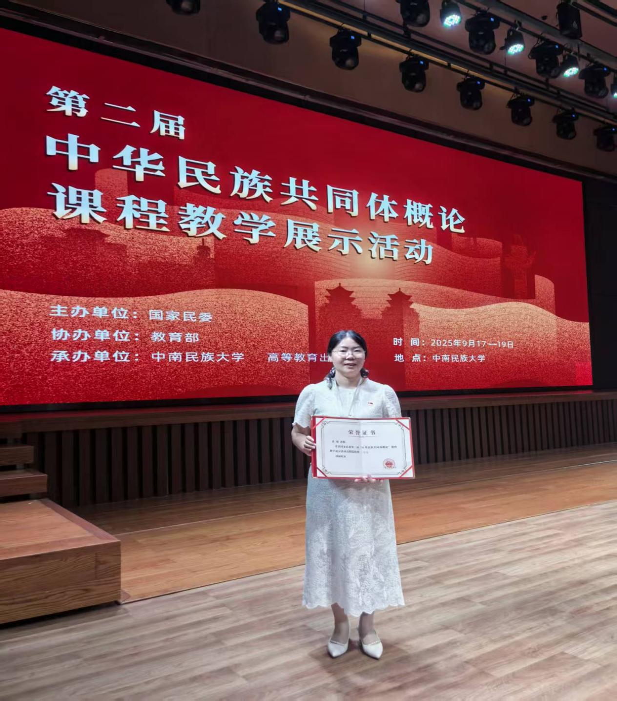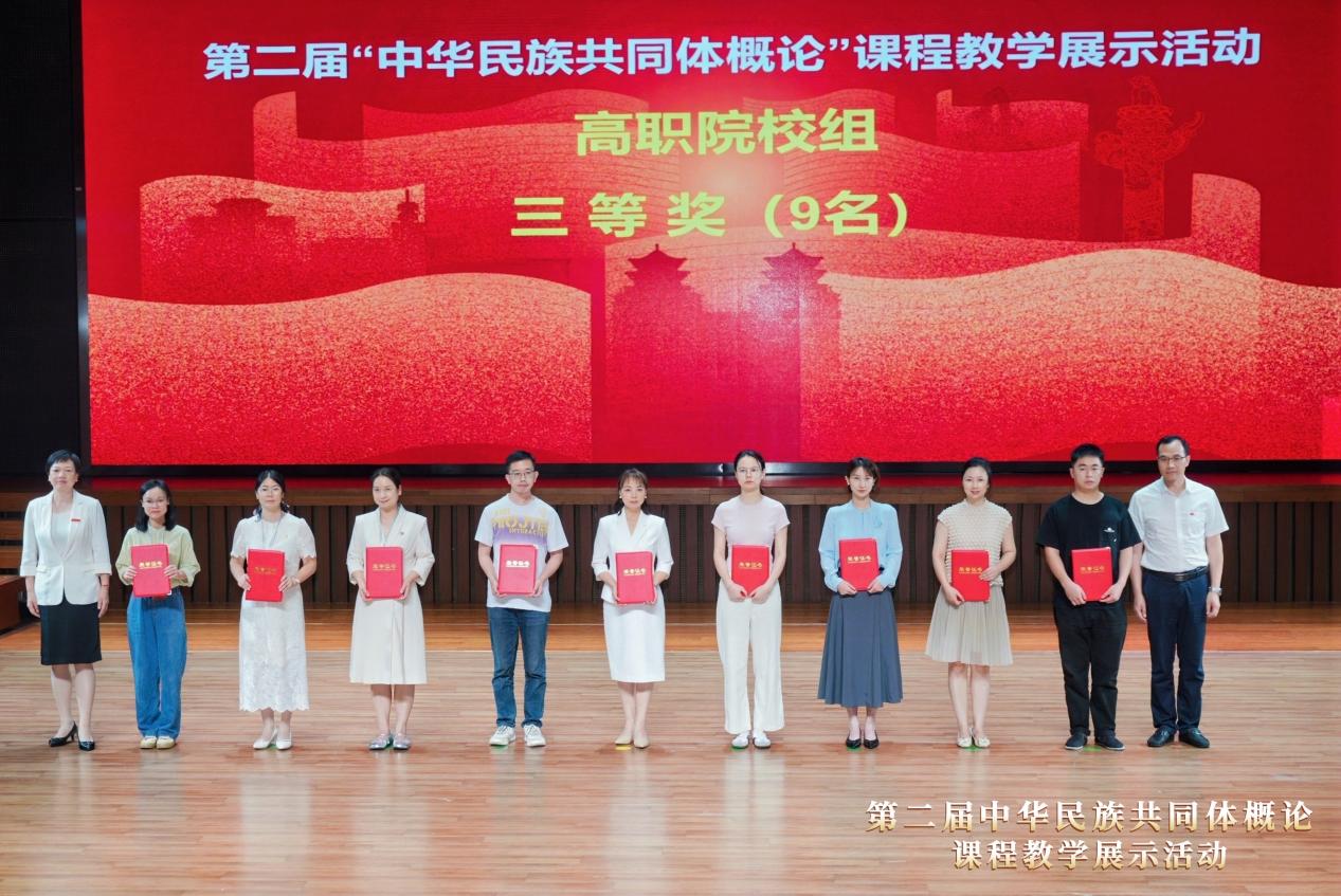 9月19日,由国家民委主办的第二届“中华民族共同体概论”课程教学现场展示活动在中南民族大学圆满落下帷幕。本次展示活动共有525所高校的767名教师参加,经评委分组评审,最终确定105名教师进入现场展示环节,竞争异常激烈。我院饶娇老师凭借扎实的专业素养和过硬的教学本领,从入围决赛的32所高职院校教师代表中脱颖而出,荣获三等奖。