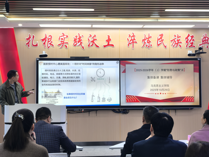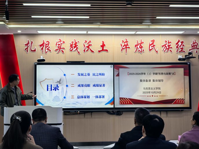 为深入学习习近平新时代中国特色社会主义思想,落实中共中央、国务院《关于加强和改进新形势下高校思想政治工作的意见》、教育部《普通高校马克思主义学院建设标准》等文件精神,更好地落实立德树人根本任务,10月29日上午,马克思主义学院在笃教楼“大思政课”教研示范中心开展了2025-2026学年秋季学期第三次《形势与政策》集体备课会。学院党委副书记、副院长邱明科,党委委员、副院长陈再蓉,党委委员、副院长(援疆)陈卿,党委委员、宣传部(统战部)部长周军等学院领导和各分院领导以及学院专兼职思政课教师共50余人参加了本次集体备课会。