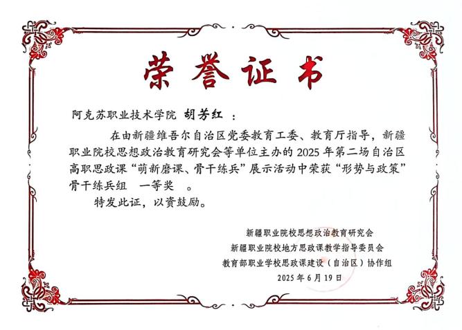 6月18日,自治区第二场高职思想课“萌新磨课、骨干练兵”教学展示活动完满结束。本次活动汇聚全区思政教育精英,成为思想碰撞、经验交流的重要平台。经历校内初选、线上复选、现场展示三轮比拼,我院胡芳红老师荣获“形势与政策课”骨干练兵组一等奖,范文艳老师荣获该课程萌新磨课组二等奖。这份荣誉,不仅是对老师个人教学能力的高度褒奖,更是我院深耕思政教育的生动写照。